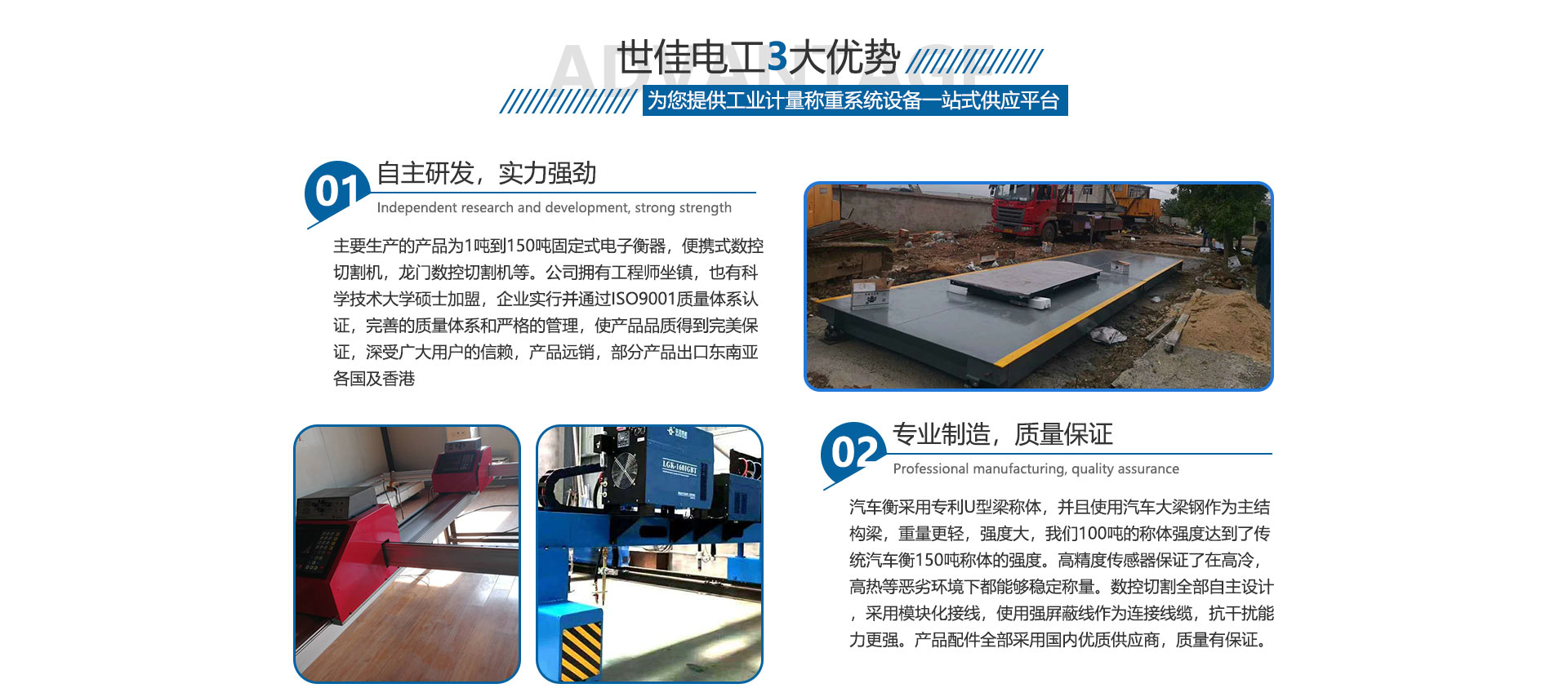 關于我們合肥世佳電工設備有限公司是生產、銷售工業自動化設備。主要生產的產品為1噸到150噸固定式電子衡器,便攜式數控切割機,龍門數控切割機等。公司擁有工程師坐鎮,也有中國科學技術大學碩士加盟,完善的質量體系和嚴格的管理,使產品品質得到保證,深受廣大用戶的信賴,產品各地可售,部分產品出口東南亞各國及香港,數控切割設備也在安徽處于前列。我們并不滿足現在所取得的成就,公司繼續(xù)加大科研投入,正在和中科大物理研究所科研人員共同研究開發(fā)下一代衡器控制儀表,希望以技術作為突破口,將公司做大做強,為中華崛起盡自己一份綿薄之力。歡迎廣大客戶來廠參觀訂貨考察。